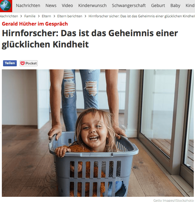 „Für den Hirnforscher Gerald Hüther steht fest: Um glücklich zu sein, muss ein Kind spüren, dass es um seiner selbst willen geliebt wird. Ist das nicht der Fall, verändert sich das ganze Wesen des Kindes. Er definiert die Formel für ein glückliches Aufwachsen.“ Focus.de