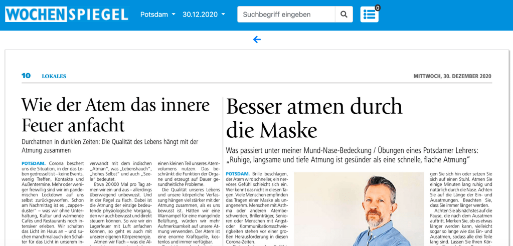 Ich freue mich sehr, zusammen mit meinem Kollegen Andreas Fiedler und mit der Unterstützung des gesamten Teams von Potsdams Netzwerk Ganzheitlich Gesundheit in der Potsdamer Wochenspiegel zu sein. Klick auf den Bild.